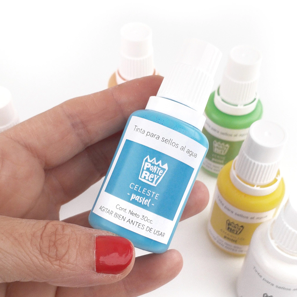 Botellita de 30cc, contiene tinta en base al agua PASTEL CELESTE para sellos de goma, aptas para papel y cartón.